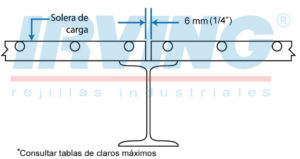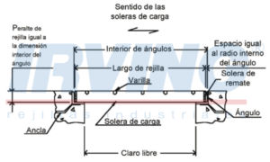 Las rejillas soportan la carga con las soleras, por lo que estás deben estar colocadas siguiendo el sentido de la distancia entre apoyos (claro máximo), según corresponda al tipo de rejilla.